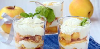 Потребно: 2 јаболки или круши 1 лажица шеќер 1 лажичка цимет 1 пудинг од ванила (сварен во 500 мл млеко) 100 г бисквити Подготовка: Излупете...