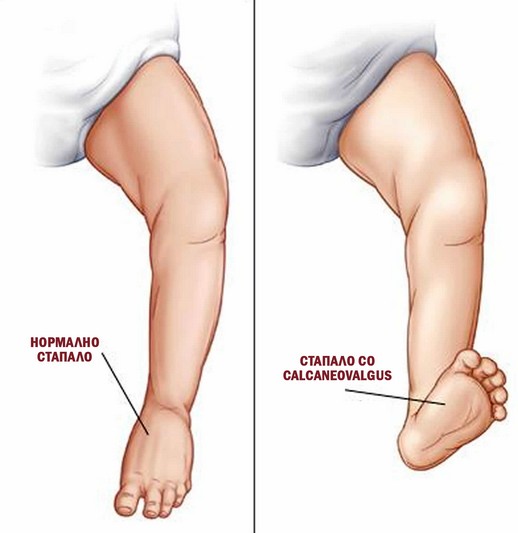 CALCANEOVALGUS е деформитет кој се карактеризира со прекумерно свиткано стапало кон горе, а петицата кон внатре. Причина за појава на овој деформитет е одржување подолг период несоодветна положба интраутерино (во матката). Најчесто поминува без компликации, без потреба од лекарска интервенција, во првите недели од животот, но понекогаш има потреба од примена на вежби за истегнување на тетивите.