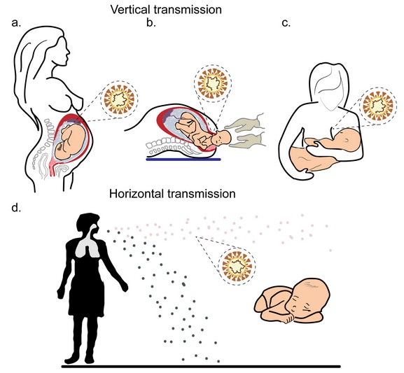 Пред да ги пренесе на фетусот или бебето, бремената жена или жената која дои може да добие вертикално преносливи болести на многу начини, вклучувајќи преку: