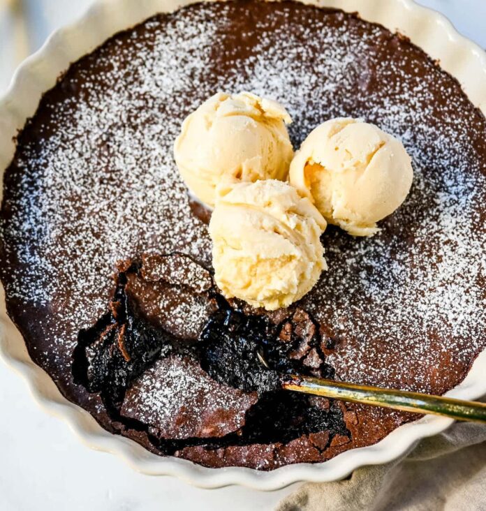 Подготовка: Загрејте ја рерната на 160 °C. Лесно подмачкајте плех за печење со димензии од приближно 23 × 30 × 5 см. Растопете го путерот и оставете го да се олади. Матете ги јајцата и шеќерот со миксер на средна до висока брзина 5-10 минути, додека смесата не стане многу густа и светло жолта. Во меѓувреме, просејте го какаото и брашното заедно и оставете го настрана. Кога смесата од јајца и шеќер е готова, намалете ја брзината на ниско и додадете го екстрактот од ванила, ликерот од малина (доколку користите) и смесата од какао и брашно. Мешајте само додека не се соедини. Додека миксерот сè уште работи на ниска температура, полека додадете го изладениот путер и мешајте кратко, само додека сè не се соедини. Истурете ја смесата во подготвениот плех и ставете ја во голем плех за печење. Истурете многу топла вода од чешма во поголемиот плех, така што ќе стигне до половина од плехот за торта. Печете точно 1 час. Средината ќе изгледа недопечена, но така треба да биде – овој десерт е некаде помеѓу брауни и пудинг. Оставете да се олади и послужете со сладолед од ванила. Добар апетит!