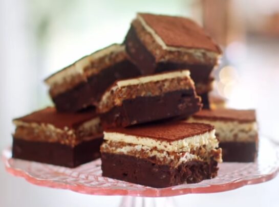 Подготовка: Растопете го путерот, шеќерот и какаото на пареа. Додадете го изматено јајце и добро измешајте и варете на пареа 2-3 минути, мешајќи постојано, додека смесата не се згусне. Додадете ги мелените бисквити, кокосот и оревите и добро измешајте. Истурете ја смесата во мал квадратен калап обложен со хартија за печење. Оставете да се олади во фрижидер најмалку 30 минути. Во сад измешајте го путерот, шеќерот во прав, ванилата, прашокот за пудинг и млекото додека не добиете мазна, лесна крема. Рамномерно распоредете ја врз изладената основа и вратете ја во фрижидер. Растопете го чоколадото и путерот на пареа. Изладете малку, потоа прелијте ја кремата и внимателно израмнете ја. Оставете го колачот во фрижидер најмалку 2 до 3 часа, а идеално е преку ноќ, за да можат слоевите убаво да се стиснат. Добар апетит!