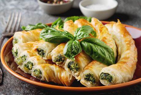 Подготовка: Тестото прво се замесува и се дели на четири дела, а потоа се остава да отстои. Секој дел се расукува со сукало, а потоа дополнително се растегнува со рацете додека не стане многу тенко. Првата кора се превиткува од левата и десната страна кон средината, се премачкува со масло и се полни со подготвениот фил. Потоа се превиткува за да се затвори. Истата постапка се повторува и со другите кори, кои потоа се ставаат на плех за печење. Се пече на 170 степени, додека не порумени. Добар апетит!