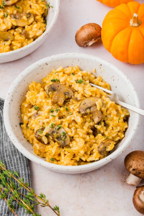 Подготовка: Загрејте го маслото во длабока тава и додадете го кромидот. Пржете на тивок оган 2–3 минути додека омекне. Додадете го лукот и печурките. Гответе неколку минути додека печурките не пуштат течност и таа испари. Ставете ја тиквата и промешајте. Додадете го оризот и мешајте 1–2 минути додека не стане стаклест. Истурете го виното (ако користите) и гответе додека не испари. Почнете да додавате од супата – по една-две лажици, мешај постојано. Додавајте нова течност штом се впие. Продолжете вака 20–25 минути додека оризот не стане кремаст, а тиквата целосно мека. Тргнете од оган, додадете пармезан и малку путер за дополнителна кремавост. Зачинете со сол, бибер, свеж магдонос и – по желба – малку рузмарин. Сервирајте со уште малку рендан пармезан одозгора и свежо мелен бибер. Добар апетит!