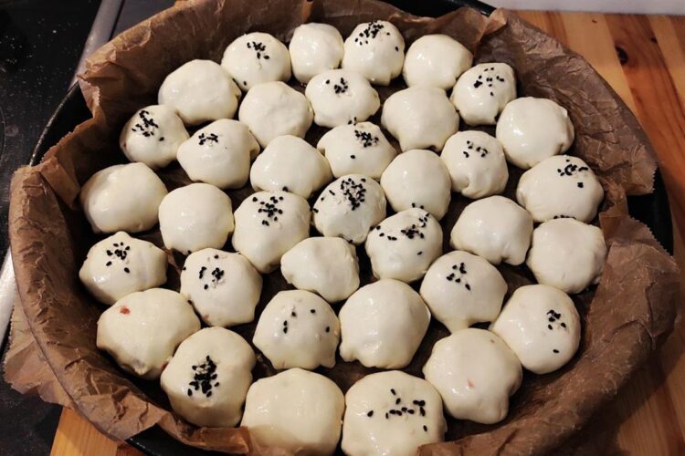 Подготовка: Добро измешајте ги сите состојки за филот. Исечете го тестото на 18 коцки (вкупно 36). Ставете малку фил на секоја коцка и свиткајте ги краевите навнатре за да формирате топка. Наредете ги мантите на плех обложен со хартија за печење и премачкајте ги со малку маслиново масло. Декорирајте со семки по желба. Печете во претходно загреана рерна 20 минути на 230 степени, потоа намалете ја температурата на 200 степени и печете уште 20 минути. Сервирајте ги мантиите прелиени со сос или послужете го сосот како прилог. Добар апетит!