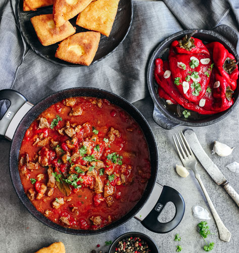 Подготовка: Пржете го кромидот во маст додека не стане темен и мек. Додадете го исеченото месо на кромидот и запржете го од сите страни додека не добие боја. Додадете ги исечканите моркови, ситно сечканиот лук, мелената пиперка и концентратот од домати, прелијте го црвеното вино и динствуваајте кратко додека алкохолот не испари. Потоа додадете вода или бујон и зачини (ловоров лист, зрна бибер, сол) и гответе го гулашот полека на тивок оган најмалку два часа, додека месото не омекне и сосот малку не се згусне. Добар апетит!
