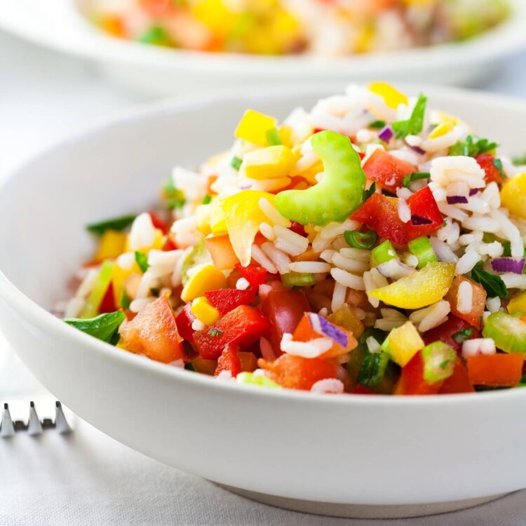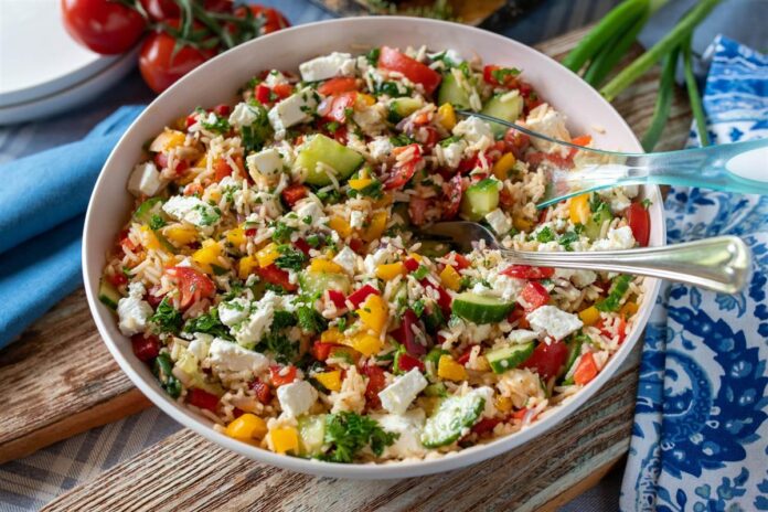 Подготовка: Добро исплакнете го оризот под ладна вода. Гответе во солена вода според упатствата на пакувањето. Кога ќе се свари, исцедете го и оставете го целосно да се олади. Додека оризот се лади, исечете ја краставицата на коцки, преполовете ги чери доматите и исчистете ги и исечете ги пиперките на помали парчиња. Ситно исечкајте го црвениот кромид. Во голем сад, измешајте го маслиновото масло, сокот од лимон, ситно сечканиот лук, ориганото, солта и биберот. Добро измешајте за да добиете ароматичен дресинг. Додадете го изладениот ориз и подготвениот зеленчук во садот со маринадата. Нежно измешајте сè за да се соединат состојките рамномерно. Исечкајте го фета сирењето на коцки или лесно издробете го со раце и измешајте го во салатата. На крај, додадете го свежо сечканиот магдонос и зачинете доколку е потребно. Можете да ја послужите салатата веднаш или да ја оставите во фрижидер 15-20 минути за да се соединат вкусовите уште повеќе. Добар апетит!