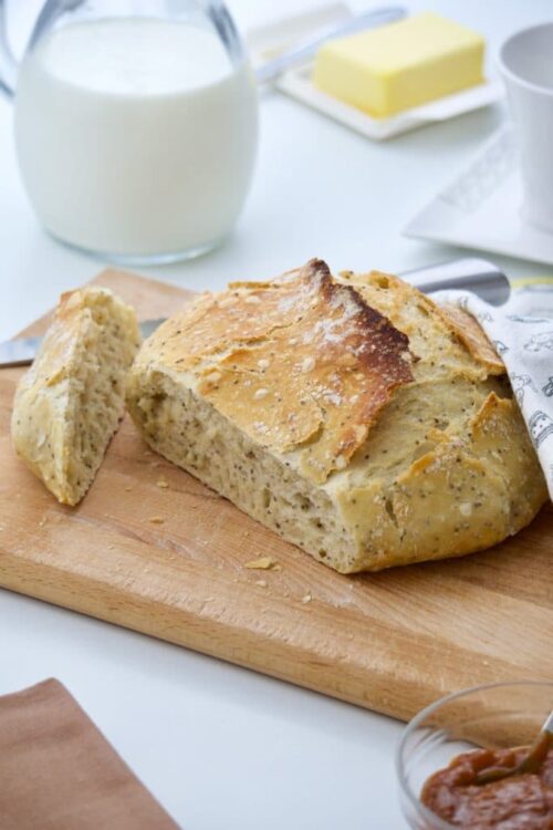 Подготовка: Во голем сад, измешајте го брашното, квасецот и солта. Додадете ја топлата вода и мешајте со шпатула додека сите состојки не се соединат во груба топка тесто. Нема потреба да месите рачно. Покријте го садот со проѕирна фолија и оставете го на топло место да нарасне два до три часа, или додека не се дуплира во големина и не се полни со меурчиња. Можете да го испечете тестото веднаш или, за побогат вкус, да го ставите во фрижидер и до три дена откако ќе нарасне. Лесно набрашнете голем плех за печење. Превртете го тестото на друга набрашнета работна површина. Пресечете го на половина со остар нож. Нежно обликувајте го секој дел во издолжен леб долг околу 20 сантиметри. Ставете ги лебовите на подготвениот плех, лесно покријте ги со проѕирна фолија и оставете ги да нараснат уште 45 минути. Во меѓувреме, загрејте ја рерната на 245°C. Отстранете ја фолијата од лебовите и неколку пати исечете го горниот дел со остар нож. Ставете го тавчето со леб на средната решетка во претходно загреаната рерна. На дното од рерната ставете огноотпорен сад со околу 2 шолји заовриена вода и брзо затворете ја вратата. Пареата е клучна за крцкава кора. Печете 20-25 минути, додека лебот не добие убава златно-кафеава боја. Готово е кога ќе звучи шупливо кога ќе чукнете по дното. Добар апетит!