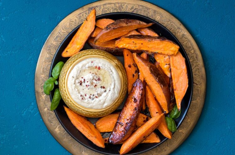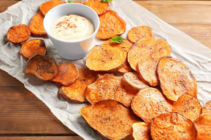 Подготовка: Загрејте ја рерната на 200 °C. Излупете го слаткиот компир или добро измијте го ако ја оставате кората, потоа исечете го на еднакви стапчиња или парчиња со дебелина од околу 1,5 см. Ставете ги во сад, додадете маслиново масло, сол, бибер и рузмарин и добро измешајте. Наредете ги слатките компири во еден слој на плех обложен со хартија за печење. Печете 15 минути, потоа свртете ги парчињата и печете уште 5 – 10 минути, додека не омекнат одвнатре и не станат златно-крцкави однадвор. За сосот, измешајте го јогуртот, сокот од лимон, власецот, солта и биберот. Сервирајте ги печените слатки компири топли, со сосот од страна. Добар апетит!