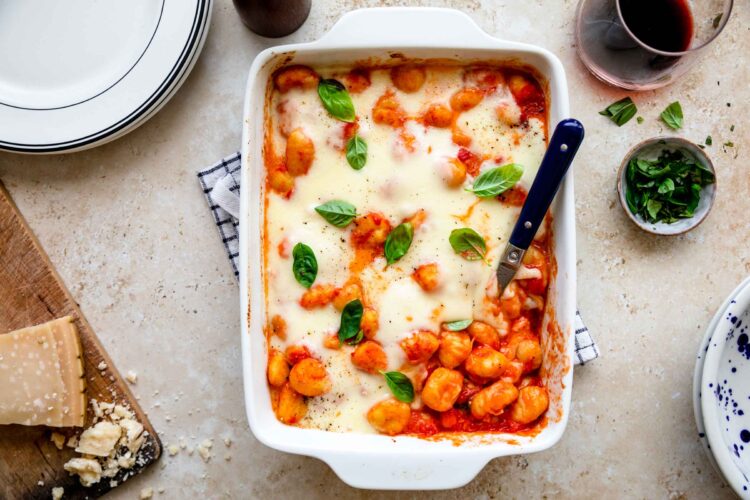 Подготовка: Сварете ги њоките во врела солена вода додека не испливаат на површината. Лесно пропржете го ситно исечканиот лук во маслиново масло. Додадете ги доматите, посолете и гответе 10 минути додека сосот не се згусне. Додадете ги сварените њоки, добро измешајте. Посипете со пармезан, декорирајте со босилек и, по желба, додадете тиква, костени или зеленило за есенски изглед. Добар апетит!