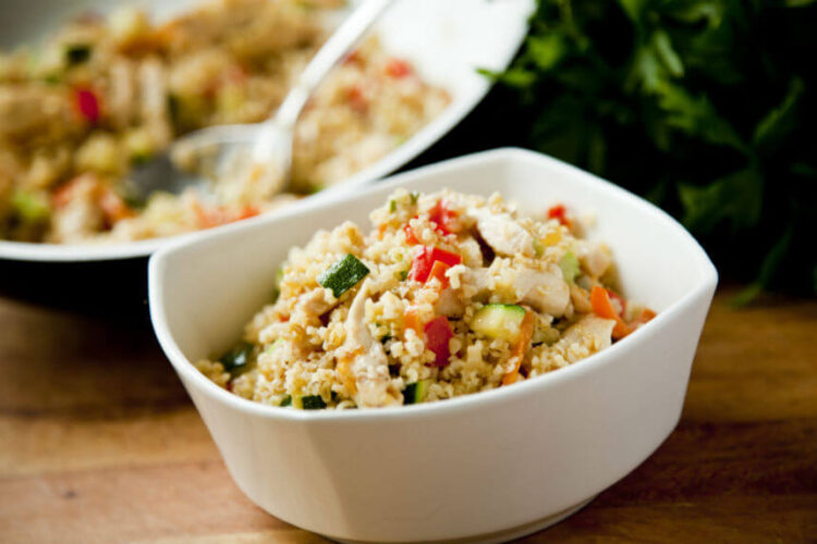 Подготовка: Прелијте го булгурот со врела вода, покријте и оставете 5-7 минути за да набабри (или подгответе го кускусот според упатството на пакувањето). Исечете го пилешкото на коцки, зачинете со сол и бибер и пржете го на масло. Исечете го зеленчукот на мали коцки, пржете кратко и измешајте го со булгурот и пилешкото. Зачинете сè со маслиново масло и сок од лимон. Добар апетит!