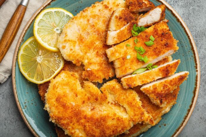 Подготовка: Искинете го лебот на парчиња и ставете го во блендер. Излупете го лукот, додадете го во блендерот и блендирајте додека не се формираат фини трошки. Ставете ги пилешките гради помеѓу два големи листа хартија за печење и со кујнско чукче удирајте ги додека не станат рамни, дебели околу 1 см. Откако ќе ги исчукате, зачинете го пилешкото со сол и обилно посипете со подготвените лебни трошки, преклопете со хартијата и добри втиснете ги трошките. Повторете го процесот и од другата страна. Ставете ја тавата на средна температура. Откако ќе се загрее, додадете една лажица маслиново масло и пржете го пилешкото 3 минути од секоја страна, или додека не стане крцкаво, златно и не се испече. Префрлете го печеното пилешко на даска за сечење и попрскајте го со малку сок од лимон. Попрскајте со малку мед, исечете го и послужете. Добар апетит!