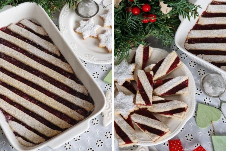 Подготовка: Замесете го тестото од горенаведените состојки, а потоа ставете го во фрижидер еден час. Поделете го тестото на два дела, од кои едниот е поголем. Развлечете го и ставете го во калапот во кој ќе се пече. Избоцкајте го тестото со вилушка и печете на 180°C околу 10 минути. Потоа извадете го и изладете го. Развлечете го вториот дел од тестото, исечете го на ленти и ставете го во замрзнувач околу 20 минути. Намачкајте го мармаладот врз изладената кора и наредете ги лентите врз мармаладот. Печете го целиот колач на 180°C околу 15-20 минути. Посипете го добро изладениот колач со шеќер во прав и исечете ги лентите со остар нож. Сервирајте. Добар апетит!