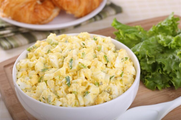 Подготовка: Ставете доволно вода во тенџере за да стигне до дното на корпата за пареа. Оставете да зоврие на висока температура. Внимателно ставете ги јајцата во корпата. Покријте го тенџерето, намалете ја температурата на средна и варете 9 минути. Подгответе ледена бања (вода + мраз) во сад. Кога јајцата ќе се сварат, извадете ги со алатка и ставете ги во ледената вода 3 минути. Излупете ги јајцата и грубо исечкајте ги. Во сад измешајте ги јајцата, мајонезот, сенфот, солта и биберот. Добро измешајте и по потреба доколку е потребно, зачинете дополнително. Добар апетит!