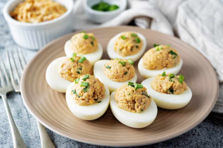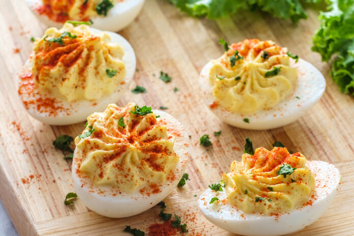 Подготовка: Излупете ги јајцата и измијте ги со ладна вода. Исечете ги на половина. Извадете ги жолчките и ставете ги во сад. Додадете го мајонезот, сенфот, лимонот, солта и биберот, магдоносот или по желба може и млад ситно сечкан кромид, па се заедно изгмечете, измешајте во мазна крема и наполнете ги белките со неа. Декорирајте по желба. Добар апетит!