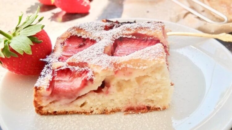 Подготовка: Во сад, прво изматете ги јајцата, шеќерот и ванилиниот шеќер додека не добиете лесна и пенеста смеса. Потоа додадете го маслото и павлаката и добро измешајте сè додека состојките не се соединат. Во друг сад, измешајте го брашното, прашокот за печиво и прстофат сол, а потоа постепено додавајте ја оваа смеса во влажните состојки. Мешајте нежно додека не добиете мазно тесто без грутки. Обложете тава за печење со хартија за печење, а потоа истурете половина од подготвената смеса во неа. Наредете ги исечените јагоди врз тестото, а потоа прелијте ја остатокот од смесата врз нив. Наредете уште неколку јагоди одозгора. Печете го колачот во претходно загреана рерна на 175 °C приближно 35 до 45 минути, во зависност од јачината на рерната. По печењето, оставете го колачот целосно да се олади, а потоа по желба посипете го со шеќер во прав. Најдобро е кога ќе отстои неколку часа, бидејќи тогаш тестото ги впива соковите од јагодите и станува уште посочно. Добар апетит!
