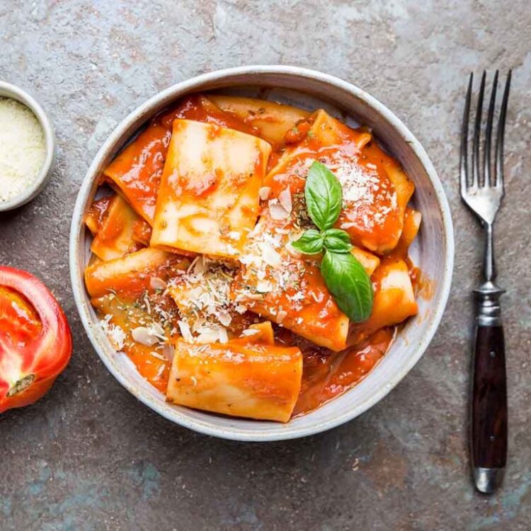 Подготовка: Ситно исечкајте го кромидот и загрејте го сончогледовото масло во тава. Лесно пропржете го кромидот. Додадете го меленото месо, зачинете по вкус и динствувајте додека не порумени. Во меѓувреме, сварете ги тестенините во солена врела вода според упатствата на производителот. Исечете ги доматите и печурките на помали коцки и измешајте ги со месото. Динствувајте уште неколку минути додека зеленчукот не омекне. Потоа додадете ја павлаката, промешајте и динстајте кратко за да се згусне сосот. Додадете ги исцедените тестенини директно во сосот, мешајќи нежно за да се премачка сè. Потоа наросете со рендана моцарела и оставете ги покриени една или две минути за да се стопи сирењето. Сервирајте веднаш. Добар апетит!