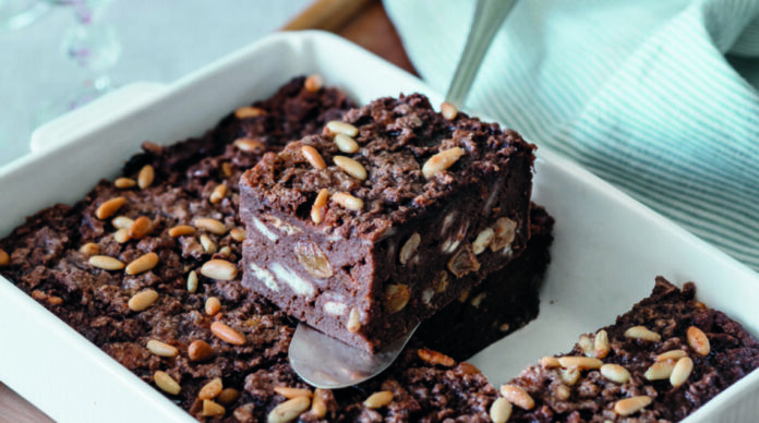 Подготовка: Исечете го бајатиот леб на парчиња и ставете го во голем сад. Прелијте го со топло млеко и оставете го да отстои 1 до 2 часа, додека целосно не омекне. Кога лебот ќе омекне, добро згмечете го со раце или вилушка додека не добиете густа каша. Додадете го шеќерот, какаото, јајцата и прстофат сол и добро измешајте сè. Потоа додадете ги грубо мелените бисквити, сувото грозје (по желба, претходно натопено во топла вода или рум), пињолите и кандираното овошје. Добро измешајте сè за да се рамномерно распоредат состојките. Намастете калап за торта со дијаметар од 24 или 26 см со путер и истурете ја подготвената смеса. Израмнете ја површината со лажица. Печете во претходно загреана рерна на 180 °C околу 60–70 минути, додека тортата не се стегне и не добие темна кора. По печењето, оставете го тортата целосно да се олади во калапот. Најдобро е кога ќе отстои неколку часа или дури и преку ноќ. Добар апетит!