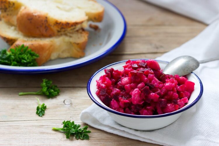 Подготовка: Измијте го цвеклото, завиткајте го во фолија и печете го 45 минути на 200 °C или варете го во вода 40 минути. Излупете го и исечете го на парчиња. Кратко пропржете го сечканиот лук во масло, додадете го цвеклото, зачинете со оцет, сол, бибер и наросете со магдонос. Сервирајте топло како прилог или лесен оброк. Добар апетит!